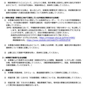 公募要項に記載されている、“本事業で取得する主な資産(単価50万円以上の建物・改修、機械装置、システム)を表でまとめます。項目、分類(日本標準商品分類)、取得予定価格(税抜き)、設置場所(事業実施場所)の項目で表にしてまとめます。これは補助金のオフィシャルサイトからダウンロードできる電子申請入力項目の資料の中に、事業計画書の部分があり、そこに表があるので参考にすると良いです。