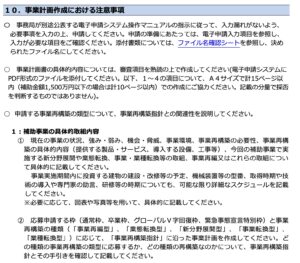 例えば要件の中に新規性要件というものがあり、“過去に製造等した実績がないこと”といった該当しない要件についても書いてありますので、そのあたりもちゃんと「当社では、過去に●●●●(今回の事業計画の商品やサービス)を行ったことはありません」と記載をしていきます。